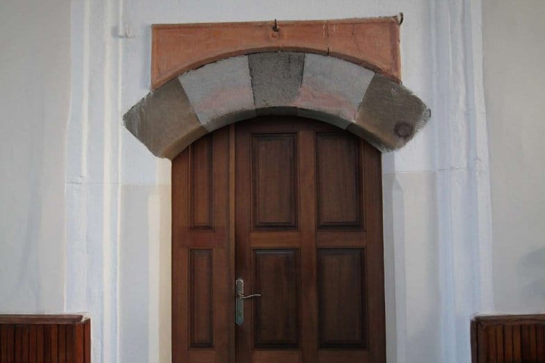 Son cemaat yerine girişi kuzey cephesinde yer almaktadır. Giriş kapısı çift kanatlı, ahşap ve dikdörtgen formludur. Yapının harim girişi, kuzey yönünde, son cemaat yerinde bulunmaktadır. Harime giriş, tek kanatlı ve basık kemerli ahşap kapı ile sağlanmaktadır. Kadınlar mahfiline, harimde, batı yönünde bulunan ahşap merdivenle çıkılmaktadır.