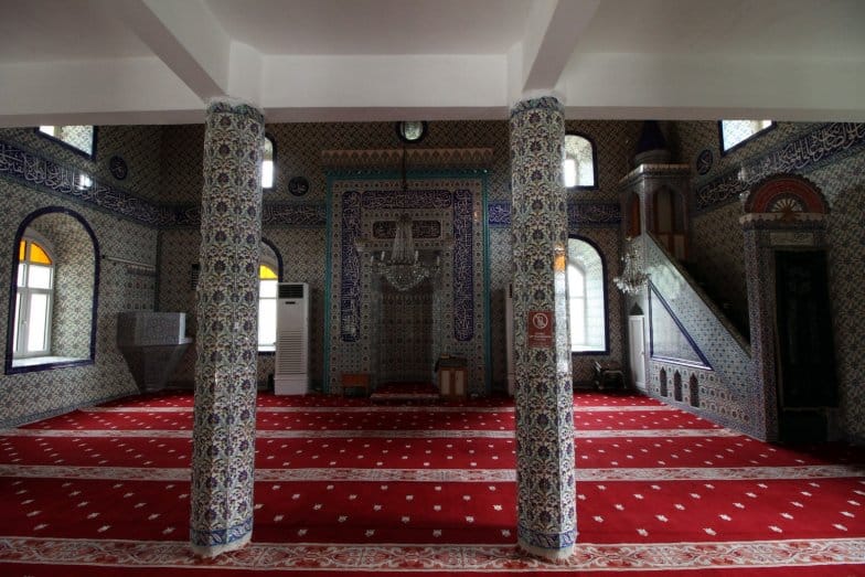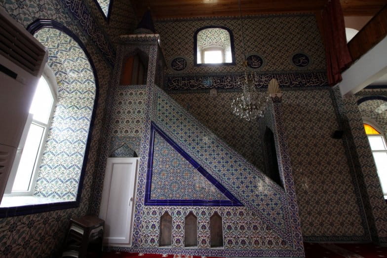Harime giriş, son cemaat yerinde bulunan yuvarlak kemerli girişten sağlanmaktadır. Kapı yenilenmiştir. Taş söveli girişin her iki yanında yivli sütunçeler yer almaktadır. Kadınlar mahfiline girişin sağında yer alan merdivenle ulaşılmaktadır. Kadınlar mahfili, iki adet sütun tarafından taşınmaktadır. Yenilenen camide duvarlar, sütunlar, mihrap, minber ve vaaz kürsüsü çini ile kaplanmıştır. Tavan ise lambri malzeme ile kaplıdır.