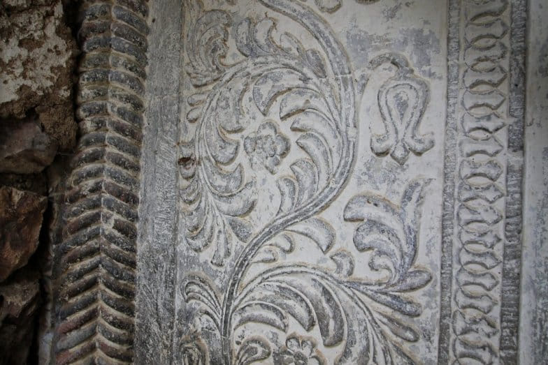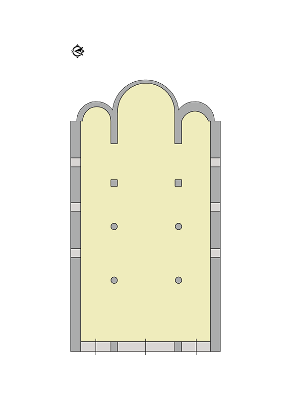 Üst örtü beşik tonoz şeklindedir ve merkezi kubbelidir. Kubbeyi İyon başlıklı sütunlar taşımaktadır. Apsislerde yer alan nişlerde bitikisel motifli bordürler yer almaktadır.